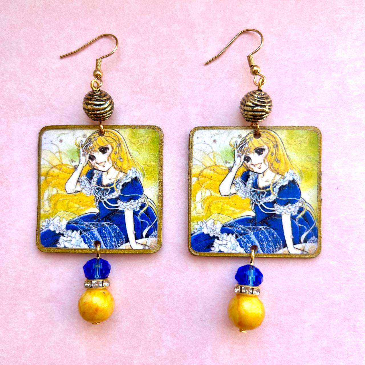 Immagini fronte-retro raffiguranti il manga "Fostine", con decorazioni in resina, strass e cristalli e chiusura a monachella in acciaio chirurgico anallergico inossidabile.