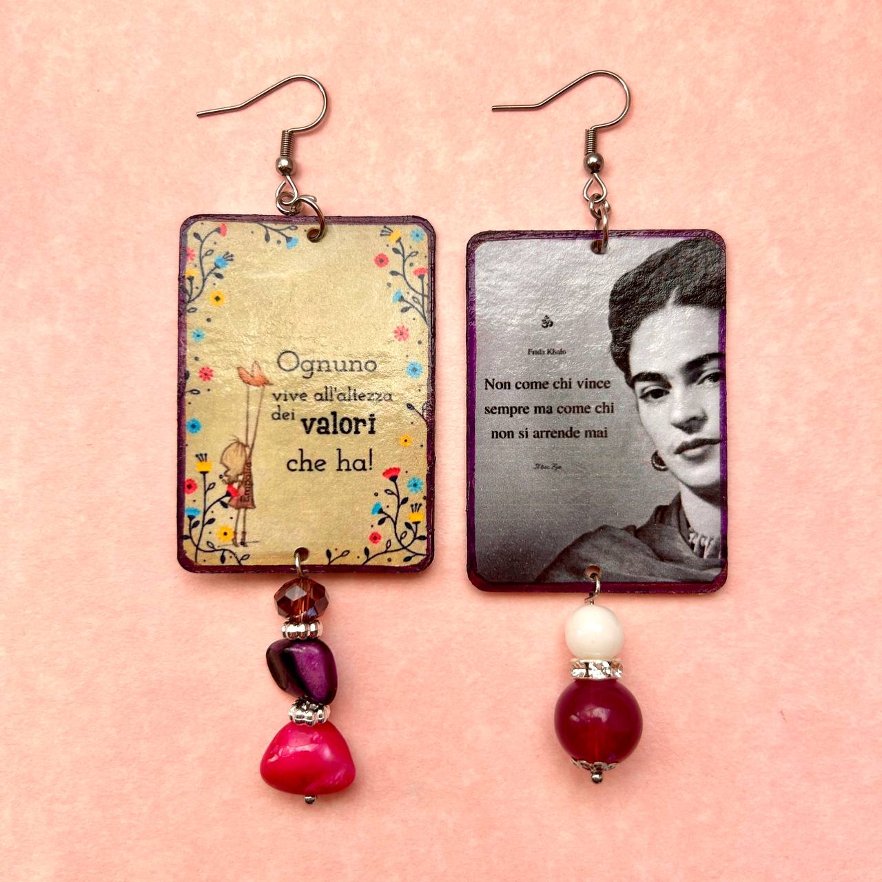 Immagini fronte-retro raffiguranti Frida Kahlo con sue frasi celebri, decorazioni in resina e pietra dura sulle tonalità del viola e chiusura a monachella in acciaio chirurgico anallergico inossidabile.