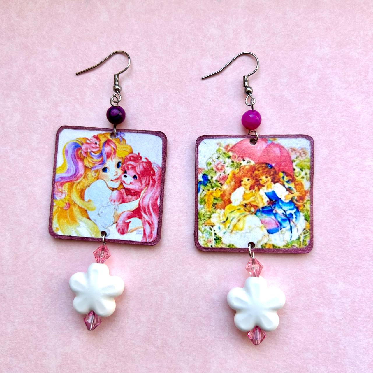 Immagini fronte-retro raffiguranti il fumetto "Lady Lovely", con decorazioni in ceramica e cristalli e chiusura a monachella in acciaio chirurgico anallergico inossidabile.