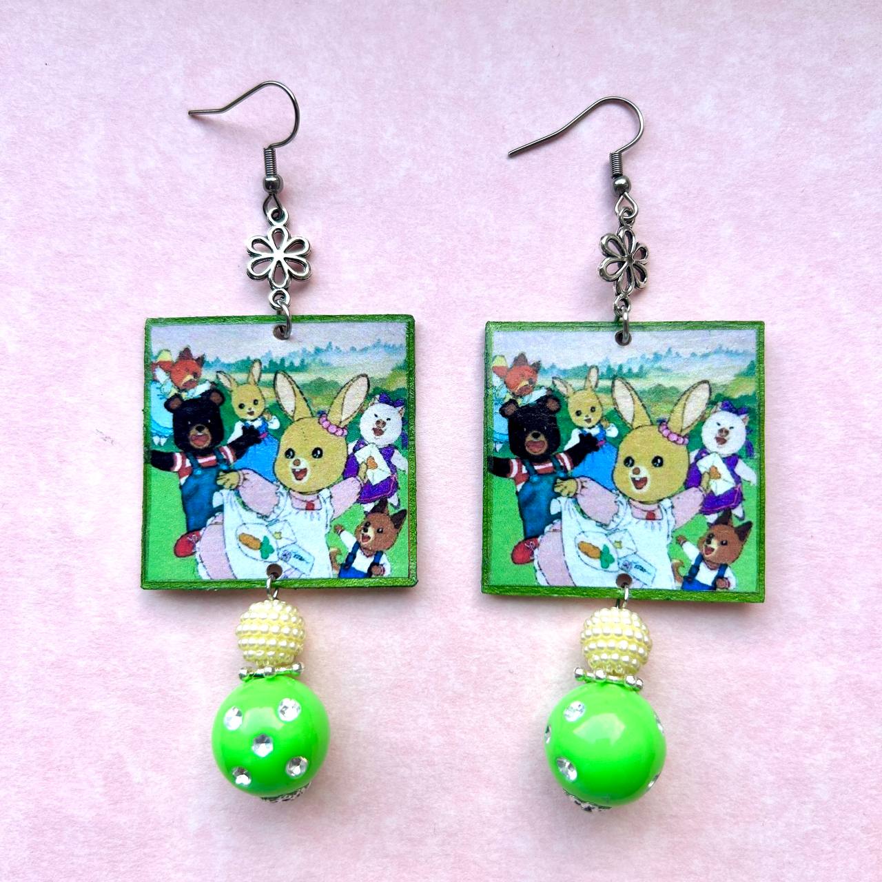 Immagini fronte-retro raffiguranti il cartone animato Maple Town, con decorazioni in resina sulle tonalità del verde e bianco, e chiusura a monachella in acciaio chirurgico anallergico inossidabile.