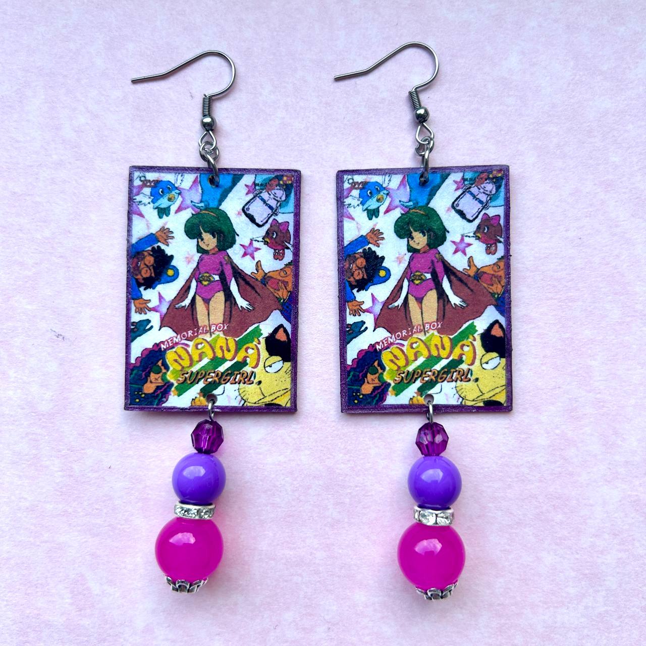Immagini fronte-retro raffiguranti il cartone animato Nanà Supergirl, con decorazioni in vetro e resina sulle tonalità del lilla/fucsia e chiusura a monachella in acciaio chirurgico anallergico inossidabile.